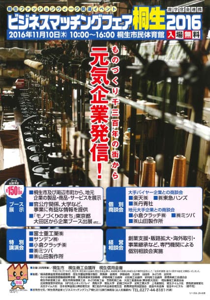 ビジネスマッチングフェア桐生2016は終了いたしました。 ご来場いただいた皆様、どうもありがとうございました。